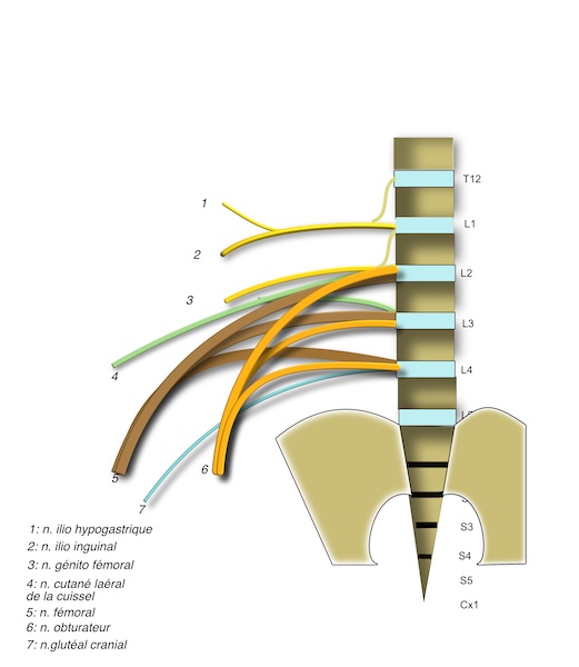 le plexus lombaire est condtitué des branches ventrales de L1 à L5: il est le contributeur de l'innervation motrice ventrale du membre pelvien et de la sensibilité des l'aine et de la face antérieure du membre.